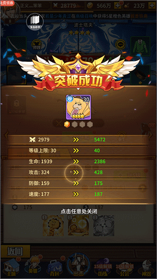5、突破成功后英雄的属性会得到巨额提升,等级上限也会随之提升一点