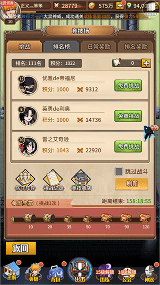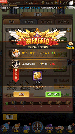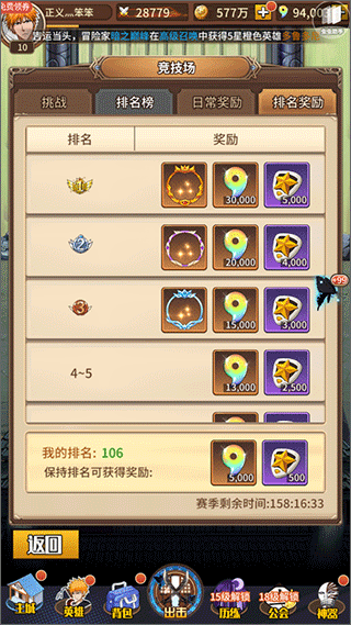 4、在竞技场有着2种奖励:日常奖励和排名奖励,我们只需保持高名次就能获得丰厚的资源。