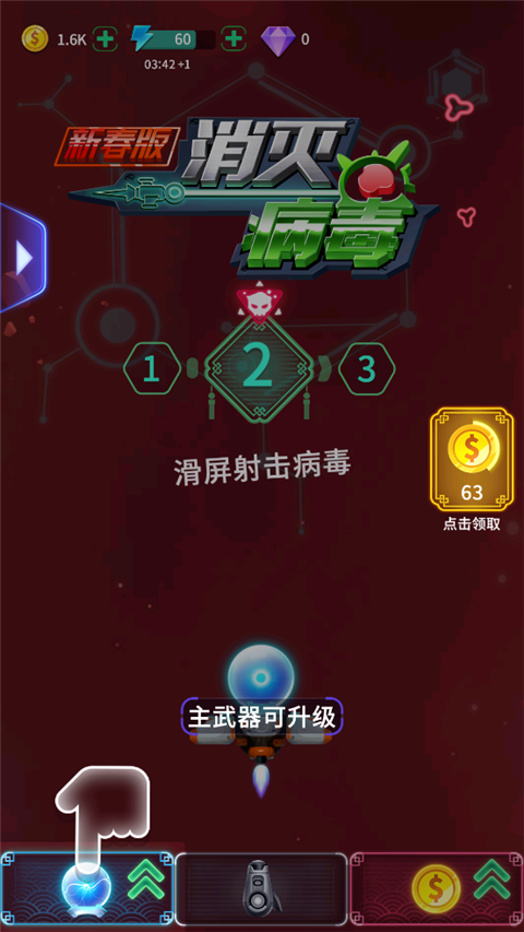 1、进入游戏后,在左上方可以看到当前金币的数量,新春版看起来也是非常的喜庆的,滑屏射击病毒即可开始游戏。