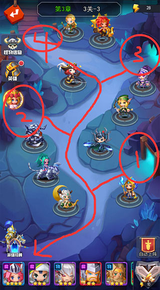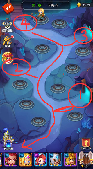 二、英雄组合搭配:1号口周围建议上高培养和带减速的英雄2号位置选择环型范围性英雄。3、4号位置为技能释放距离较远的为主。