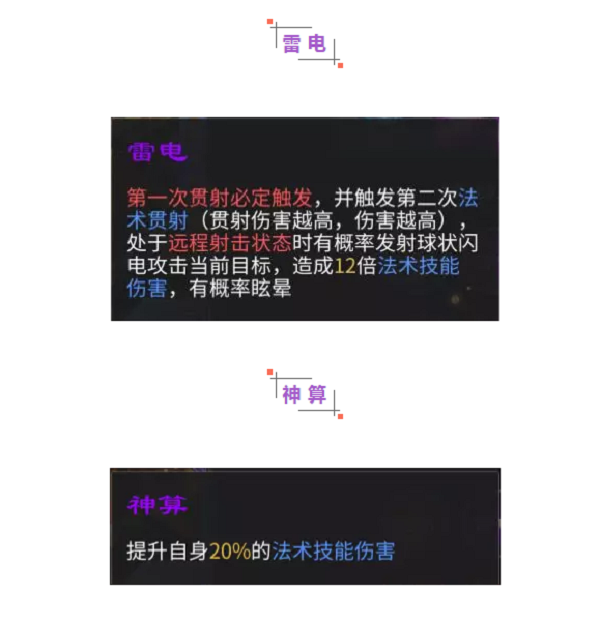 “雷电”技能,必定触发第一次贯射,并且触发第二次法术贯射,贯射的伤害越高,伤害越高。当张角处于远程射击状态时,更有概率发射球状闪电攻击当前目标并造成12倍法术技能伤害!同时,还有一定概率眩晕~