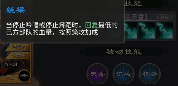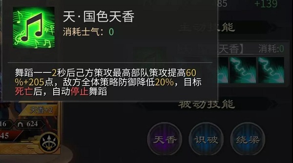 主动技能 舞蹈一一2秒后己方策攻最高部圝队策攻提高40%+65点,敌方全体策略防御降低20%,目标GG后,自动停止舞蹈