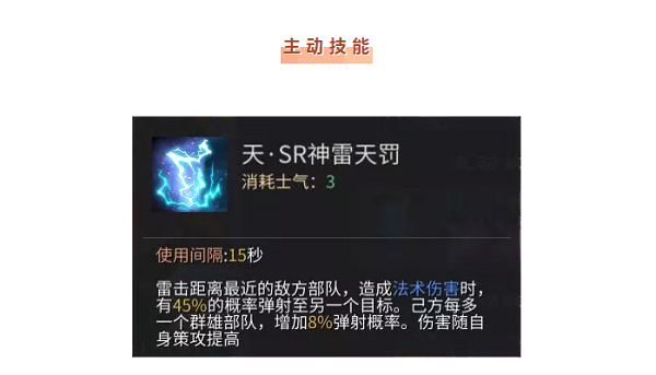 他的主动“神雷天罚”则表现的非常友好,雷击距离最近的敌方部队,造成法术伤害的同时有概率会弹射至另一个目标,只要己方每多一个群雄部队,就会为其增加弹射概率。伤害会随着其自身的策攻提高。神雷天罚一不小心就会被他弹到噢!