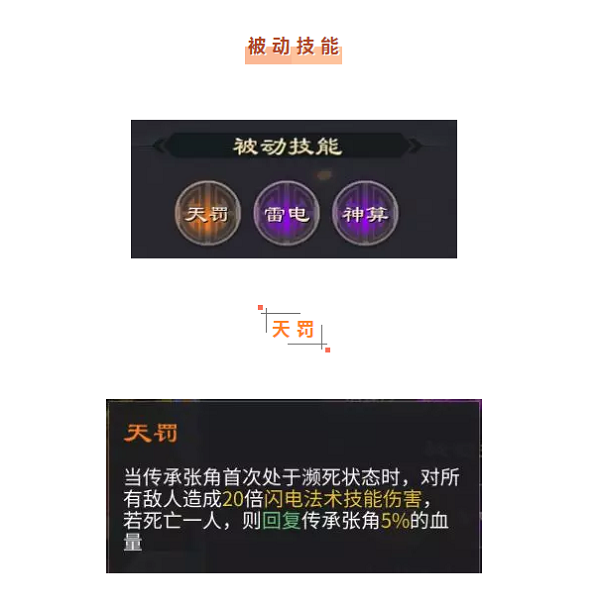 从张角的被动来看“天罚”技能——当张角首次处于濒死状态时,是首次处于濒死状态,对所有敌人造成20倍的闪电法术技能伤害,如果死亡一人,则回复张角5%的血量。