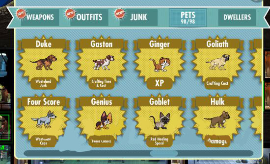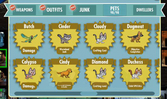 宠物是自第一代FO就有的元素,最出名的宠物Dogmeat从FO1一直到FO4都是主角身旁的明星宠物,其它宠物还包括FO3中的Bandit,Muttface等等。