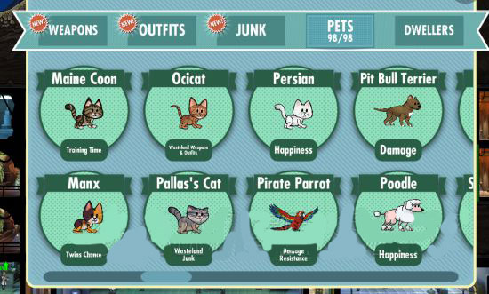 在辐射避难所这个小游戏中,1.3版本(?)引入的宠物系统大受欢迎。许多猫猫狗狗鸟鸟也包括传统FO系列的动物明星们进入了避难所,并迅速成为避难所里最可爱的一道风景线。这些宠物会给避难所的居民们带来各种各样的正面buff,极大提高生产、打造、打野、啪啪啪、做任务等等的效率(FO2厄运狗不服)。1、宠物可以分为绿宠(普通common)、蓝宠(稀有rare)、金宠(传说legendary)三种,售价分别是100、500、1000。