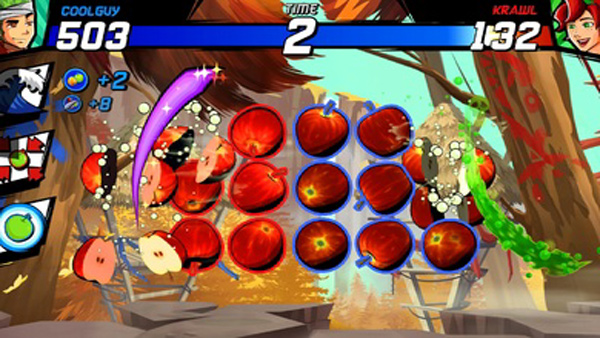 2、Zen:图标为苹果的Zen模式中,没有炸弹,只会不断出现水果,时间为1分半。在这一分半内谁因连击而切出的分数越高,谁就是胜利者。游戏不会因水果的掉落而失败。