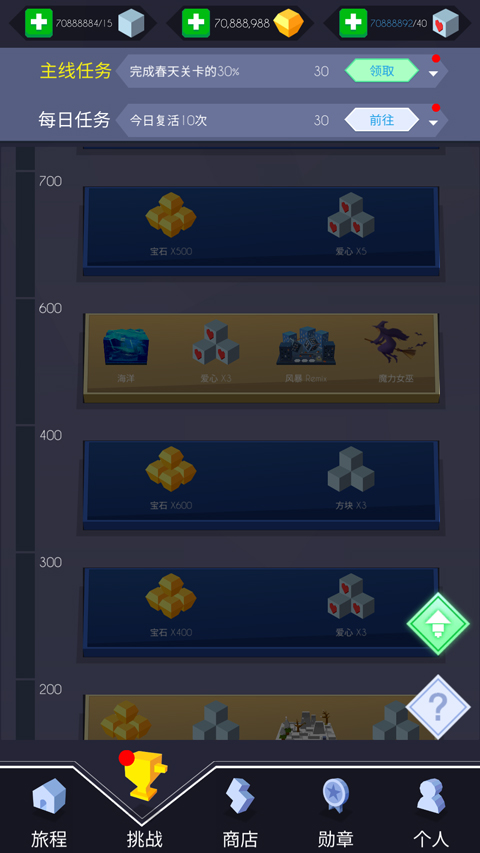 1、打开跳舞的线国际服游戏,来到“旅程”,这里分布着不同难度的重重关卡,每个关卡的背景音乐悦耳动听又充满节奏感,每玩一个关卡消耗一个方块。点击右边的“一键签到”即可签到,通常界面两边会出现一些活动,点击左上角“新春促销”即可查看活动优惠产品,在右上方“皇冠宝箱”中,在游戏关卡里收集十个皇冠即可打开皇冠宝箱,获得丰厚的奖品。