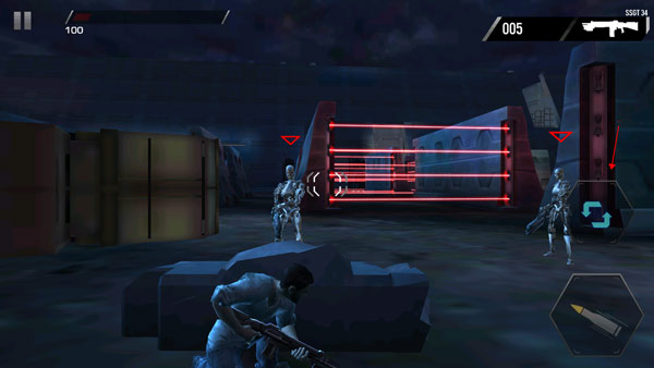 屏幕左侧控制枪械瞄准,只要对准敌人之后,就可以开始射击。右侧可以开火、切换武器,射击时对准敌人开火即可。松开主角人物,就会自动的躲入掩体里。在敌人射击的空闲时间,我们一定要快速的离开掩体射击,这样才可以快速的击杀敌人。