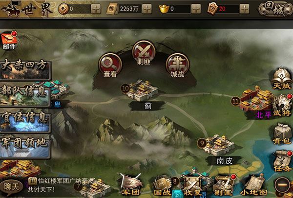 1、世界地图,恢宏战场浩大的整体式地图,60座主要城市,摒弃了州的概念,城池的开启随着主线收复任务的开展逐一解锁。尚未收复的城市上方会有云气覆盖,真实感倍增。具化到城池,游戏未采用内城的概念。世界的城池仿佛仅仅是将领的军事据点,主公可对城池开启副本剿匪、城战攻克、拜访切磋。收复该城池并不代表攻占,如果想完全攻克城池,需要对该城池宣布城战,挑战NPC守将或已攻克主公的守备军。