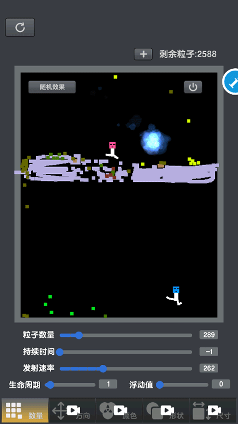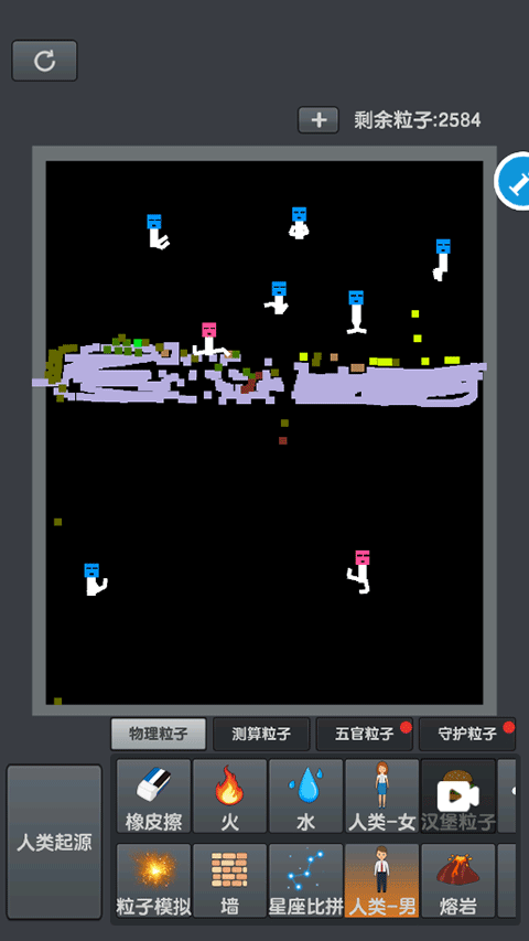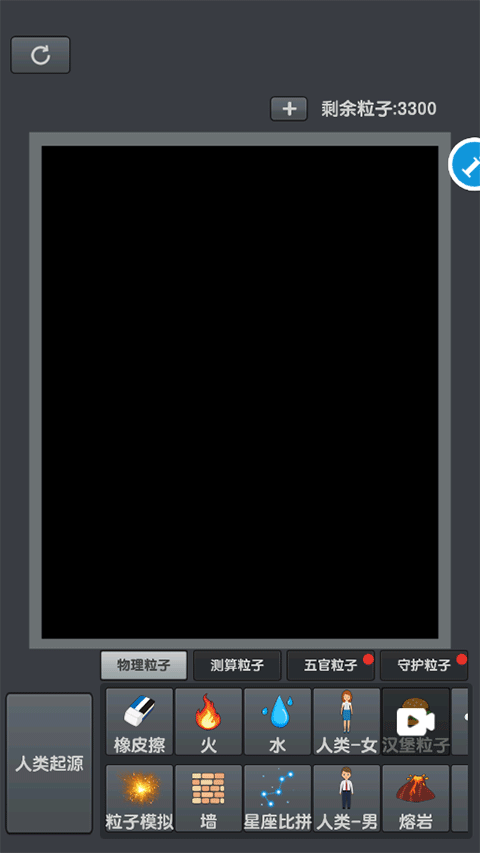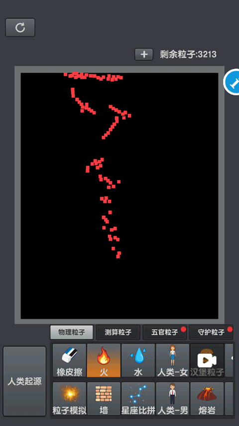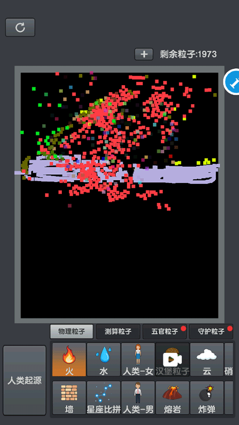 1、首先打开粉末沙盒模拟器最新版,在下方提供了很多的粒子可以创造模拟,包括了物理、测算、五官粒子等等;