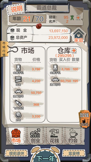 说完伴侣,再说一下倒卖商品。首先,有包包是最好的(别问我包包是什么,全称“名牌包包”,家族势力里解锁,再问我,楼主自杀给你们看),没有就优先买汽车,域名,黄金。个人不推荐比特币,主要因为爆高价概率很低,还不如买域名,而且比特币低价2000左右,平价常常才3000,虽然也有6000的,而黄金低价2000,平价稳定在5000,稳定翻一倍,爆高价概率也不错。开局,百万以前可以买一下比特币,平价卖出。其他无视即可。