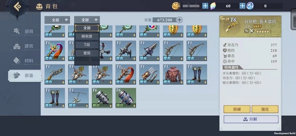 判断一件装备的品质,需要考量三个方面的因素,分别是稀有度、T段和星级。稀有度分为普通、精良、稀有、史诗和传奇,其中普通为最常见稀有度的装备,传奇为最高稀有度的装备。T段则代表了游戏的进程,随着玩家们对神角世界的探索度逐渐提升,也就会相应获得属性更强的装备。T段一共有6个等级,从T1到T6。最后是星级,每一件装备都可以通过突破来升星,突破只需要消耗相同品质的装备和一定数量的美索多(游戏货币),不需要消耗其它材料。