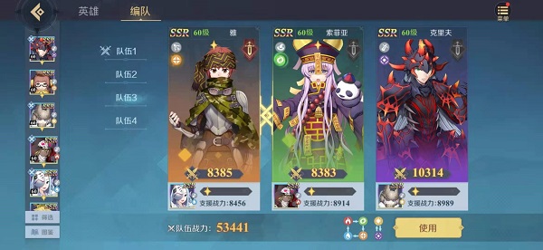 这套阵容从品质上来说非常豪华,全部都是SSR品质的英雄,并且每一个属性的英雄都有。阵容的特点是拥有强大的范围控制和清图能力,面对怪物较多场景的时候,非常适用。如果是用来打BOSS的话,会比较考验走位。技能释放的顺序,可以先释放雅的技能,然后让索菲亚出场聚怪,最后堆AOE技能清理掉怪物就可以了。助战伙伴的释放时机需要把握好,当怪物聚集到一定数量后再释放,效果会更好!