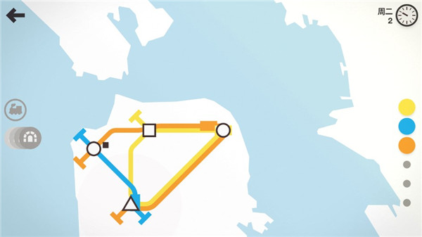 迷你地铁游戏初始拥有3条线路与3辆列车,以及若干数量的桥梁或隧道,彩色小圆点即是当前拥有的线路,灰色表示还没有解锁,不同图标代表不同类型的站点,详细解析可在后文查阅,在各个站点的右上角标表示这个站点的人想要去的站点,我们所要做的就是连接路线解决供求。