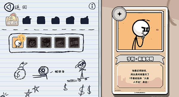 序章里有六种进入金库的方法,只有伪装成钱袋才成功,但最后还是被抓了。第二章通过锉刀逃脱,途中遇到各种挑战,比如手榴弹炸自己,马桶塞爬楼逃生等。游戏还加入了收集人物的功能,点击未收集的人物会显示蓝色提示,重复场景或放大画面更容易收集。