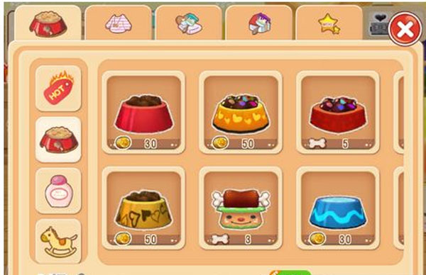 1、道具使用想要伺候好狗狗就需要食物、水、沐浴露等道具,而和1代不同,游戏前期道具都需要玩家在商城中购买,这里狗粮=增加饥饱度、水=增加饥渴度、沐浴露=增加清洁值、玩具=增加狗狗心情,而需要注意的是我们也可以通过点击抚摸狗狗的方式让他们心情更好。