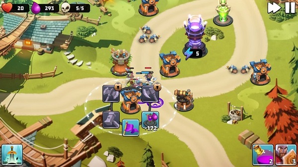 在游戏开始前会有一段教程来教玩家该怎么玩,在教程中玩家可以发现操作非常简单,主要就是建造各种不同类型的防御塔来消灭敌人,但是每种塔需要花费的紫色币是不一样的,界面左上角紫色币后面显示的数量是当前玩家拥有的紫色币,只要数量达到玩家所想建造的防御塔就可以建造了,建造防御塔并不是想在什么位置都可以,而是只能在界面紫色牌标志那里建造,不过建造防御塔是在敌人进攻前,防御塔建造好之后,玩家双击界面骷髅头图标那里便可战斗,至于会出现多少敌人,玩家可以在界面左上角有骷髅头显示的数量得知,显示几就代表几波敌人会出现。
