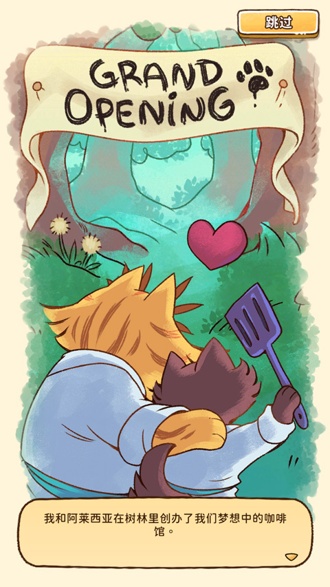 1、打开营火猫咖啡馆中文版,游戏开始前会有一段动画介绍游戏背景,点击右上角可跳过;