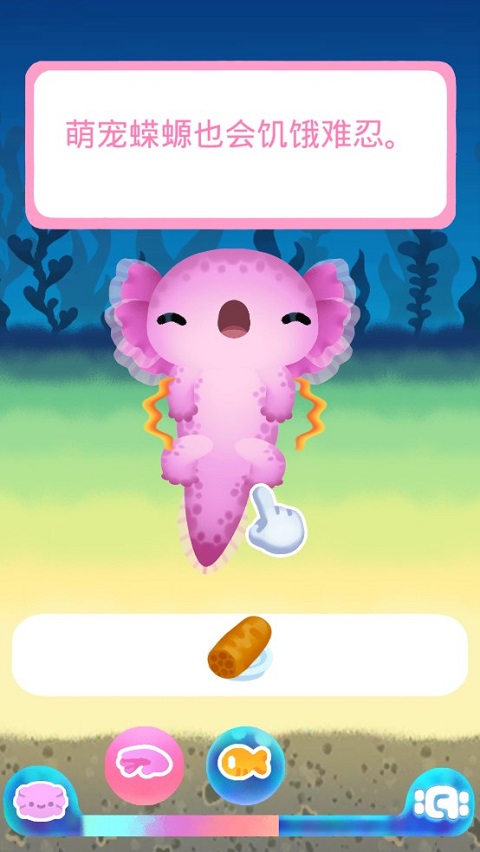 2、当然任何生物都离不开进食,可爱的蝾螈也是需要吃饭的,它们也会饥饿难耐,第二步点击“鱼”进行喂食。具体操作方式,拖动食物到蝾螈嘴里即可。