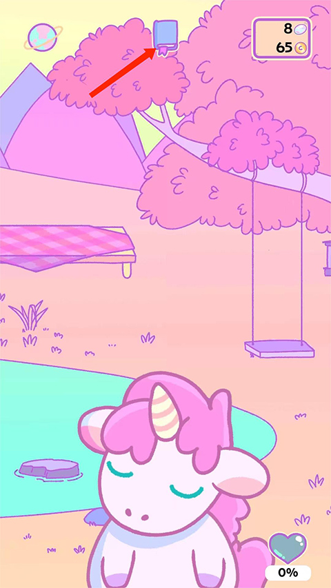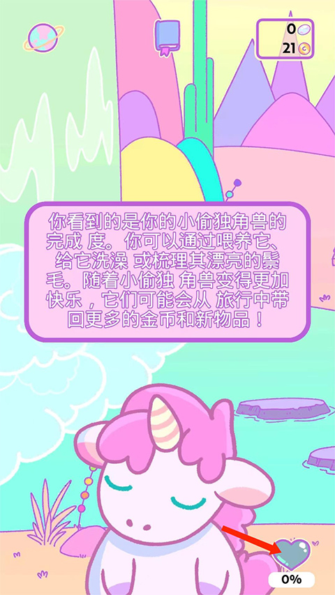 3、进入游戏主界面,右下角为独角兽的心情完成度,完成度越高带回来的金币和物品也会越丰富,点击独角兽,
