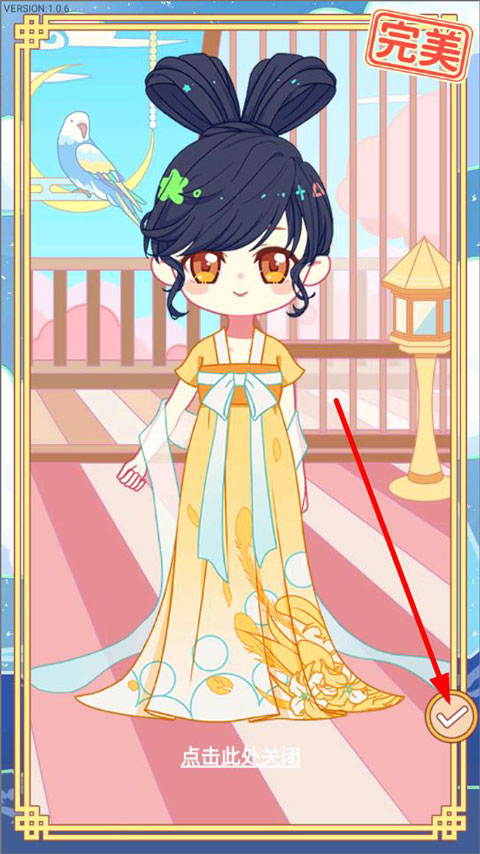 3、进入服装搭配展示环节,玩家可以看到服装的整体造型,点击右侧“√”即可保存。