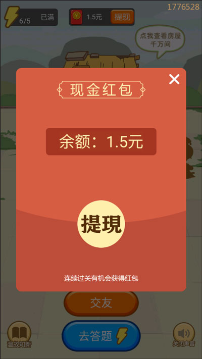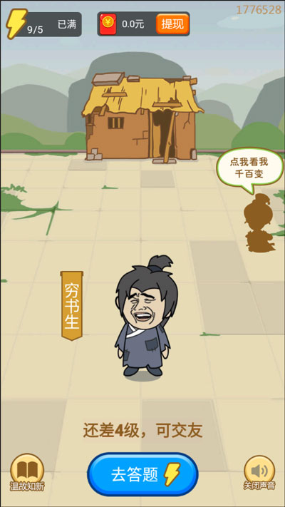 1、在本站下载安装运行秀才养成记赚钱提现版,就会看到温故知新、去答题、声音、体力、红包等功能;