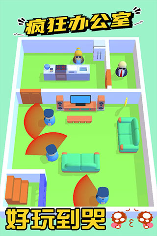 疯狂办公室是一款休闲烧脑的小游戏,非常的减压,游戏画面呈现在玩家们面前,可爱的卡通形象让玩家们爱不释手。在游戏中你是一名神秘的特工需要潜入企业的办公室中,帮雇主拿到一份神秘文件,并最终成功逃离大厦,你可以通过滑动屏幕控制角色,选择恰当的时机,避开巡逻的警卫们(在红色的视野范围外,就无法发现你),拿到指定的任务物品,这仅仅是其中一个关卡而已,游戏的设计非常的丰富,每一关都是独一无二的,你不会觉得无聊。除此之外,疯狂办公室手游还有新颖的玩法机制,魔性的剧情设定,可爱的角色,逗趣的音乐,随时绷紧你的神经,欢乐无限升级,你可以一边做任务的同时一边感受魔性的音乐,能够很有效的减缓你的压力。