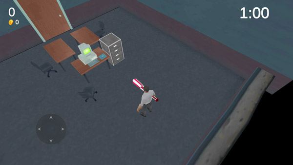 游戏玩法操作也非常简单容易,玩家可以操纵角色自由移动,前往不同房间探索破坏,感受解压的瞬间。期间随着游戏进程的向前,还有许多障碍的呈现,而每次完成挑战游戏将根据你的场内表现进行打分,还可以获得金币奖励,你可以使用金币兑换各种武器、时装等。不同武器攻击力、攻击速度等属性都有不同,选个趁手的武器,肆意破坏,砸烂这间办公室!