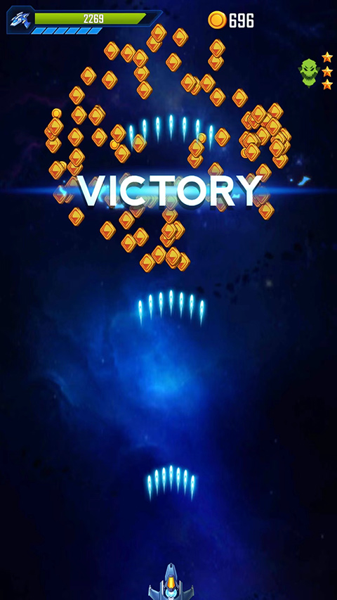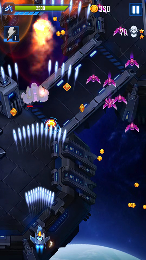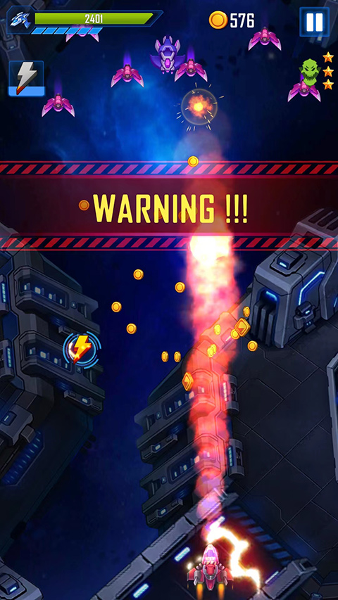 2、除主要宇宙飞船外,还有2名助手可以提高战斗力,使用激光导弹,巨型弹药和磁铁升级你的攻击强度,宇宙飞船速度。