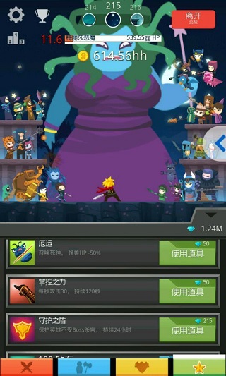 泰坦这个游戏机制非常简单,货币只有金币(打怪掉落)和钻石(点券,可充值,难获取),玩家需要用手指点击屏幕来攻击BOSS赚取货币,当然也可以解放双手雇佣随从,让他们帮你打怪,学习技能,也可以花钱购买额外的宠物和装备,然后就这么一层一层的推进。由于这个游戏数值上升的十分快,所需要升级的次数也很多(有大概三十多个英雄,一个英雄6000级,升级之后还可以再强化升级三次6000级,还有最重要的点击BOSS)。