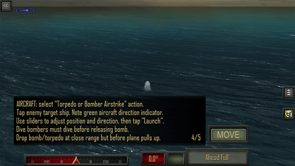 4、飞机:选择“鱼雷或轰炸机空袭”行动。点击敌方目标船。注意绿色飞机方向指示灯。点击滑块调整位置和方向,然后点击“启动”。俯冲轰炸机在投放炸弹前必须先俯冲。在飞机起飞前近距离投下炸弹/鱼雷。