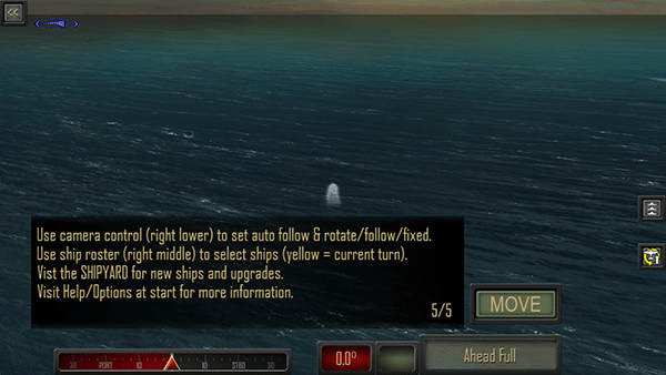 5、使用相机控制(右下)设置自动跟随&旋转/跟随/固定。使用船只名册(右中)选择船只(黄色=当前回合)。参观造船厂的新船和升级。请访问Help/ options以获取更多信息。
