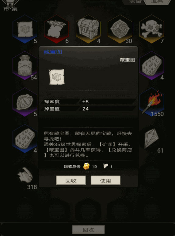 藏宝图要先通过35级世界探索后通过矿洞开采到;通过战斗获取;商店兑换。遗失秘钥可以开启神秘宝箱,也是比较珍稀的道具。
