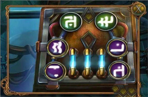 1、把能量电池装到舱室右侧的控制柜上,再用下面四个紫色图形组合成上方两个绿色符号,灯被点亮以后就可打开控制柜门。