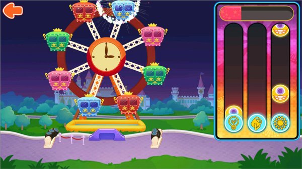 5、通过音乐游戏来为摩天轮点亮浪漫绚丽的灯光和烟花吧~当下落块落至下方与圆形图标重合时,立即点击相应图标试试吧;