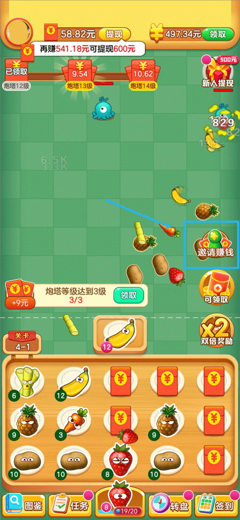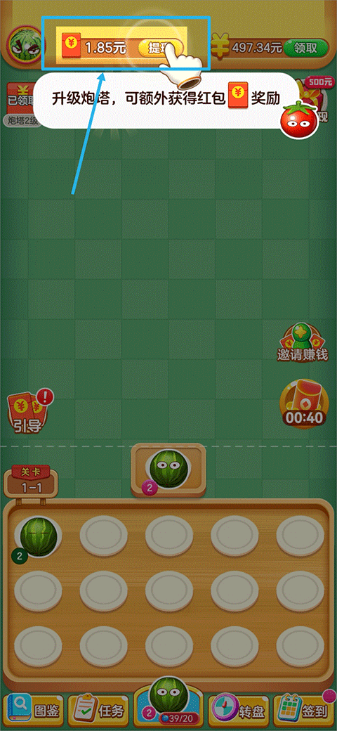 3、升级炮塔可额外获得红包奖励,获得的红包会收集在上方