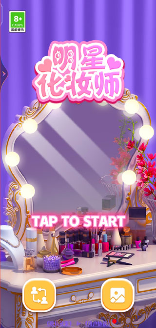 1、首先打开明星化妆师游戏最新版,左边方块可以选择将要化妆改造的人物,右边方块是相册,化完妆以后拍的照片会在这里显示,点击“TAP TO START”开始。