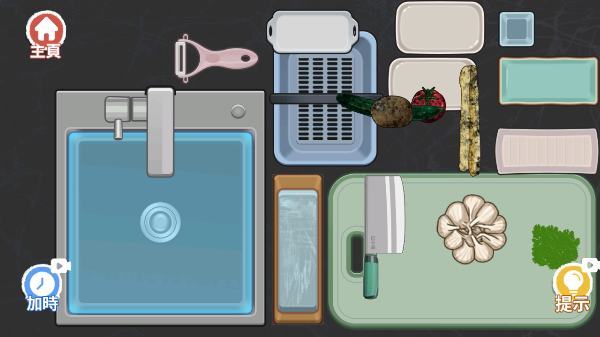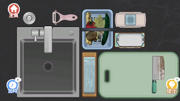 1、首先玩家进入游戏后可以看到游戏中有很多蔬菜以及很多盘子和菜刀。2、玩家需要用筛子将下水口堵住,然后将水龙头把水打开,将水池放满水关掉水龙头即可。