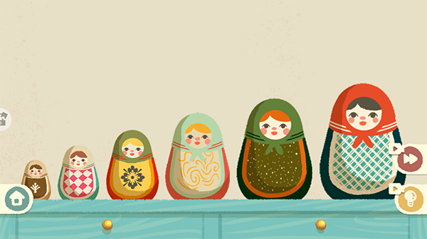 1、首先我们进入这关以后可以看到桌子上摆放了的五个俄罗斯套娃小人。