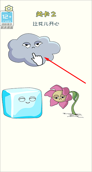 关卡2:左右滑动擦除乌云,你就会发现太阳被挡在了后面,太阳出来后就能将冰块晒化,然后花儿就开心了。