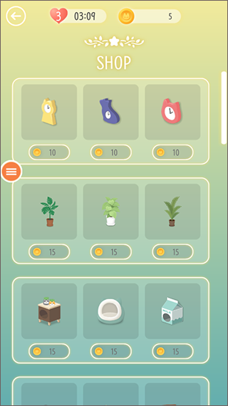 3、在游戏里玩家可以用金币购买各种各样的家具,将自己的小家装饰的非常完美,在游戏里与自己的喵咪一起愉快的生活;