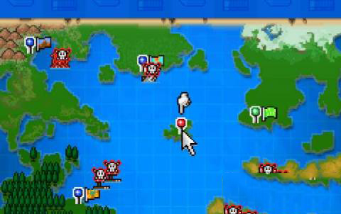 6、这就是海图,左上角那个章鱼等级比较高,等建了铁甲船再去。右下角的是2级大型帆船,难度中级,其他的都可以先打下来。点别人的港口,可以出3个选项,观光可以增加友好度,友好度用来升级事业等级输入就是进口的意思, 进口可以设置为自动,上面会显示这个港口的特产是什么,一般是食材,金属,油。右下角的壳却,就是卖出,你可以理解为出口。