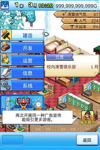另外针对于雪地方面的建设,首先肯定需要利用开拓来进行场地扩增,扩增后利用获取的资源来研究更多的娱乐设施,让滑雪的场地更加大,让大家更加的娱乐,当然了每个玩家所布局都起特殊的道理,也没有什么千篇一律的所谓布局攻略,只要不但的扩大规模则就是俱乐部发展的关键。