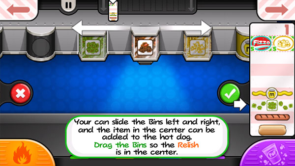 游戏的玩法也比较简单,就是根据顾客的需求给其制作各种各样的热狗,首先你需要前往订餐站给饥饿的顾客写好菜单,然后回到厨房进行热狗制作烹饪,翻转多汁的热狗和香肠,移动各种美味的调料添加到您的热狗,跳转弹出美味的饮料和弹出一些新鲜爆米花完成这顿丰盛的热狗快餐,然后等待顾客结账即可。