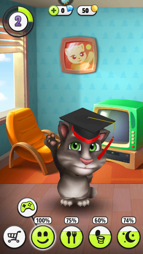 游戏特色包括从1000多种颜色、衣服和家具中选择搭配,帮助汤姆完成9个阶段的999级成长,通过互动对话让它重复玩家的话,还有戳、摸或挠它痒痒的不同反应。此外,新增了汽车蛋糕、兔子椰奶冻等食物,还增加了合成食物的功能,让玩家自己动手制作。