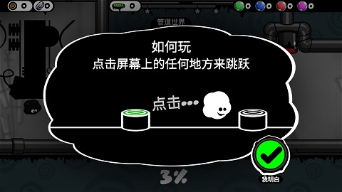 1、操纵你的小黑球不断进行跳跃,越过那些障碍物等东西,直达终点。2、不断的进行跳跃前进,使自己更加的强大,解锁更多的关卡技能。
