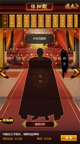 小宝当皇帝九游版是由九游平台代理运行的一款原创角色养成当官手游,打造了古色古风的精美画面,细腻还原每一次的官途升迁,并且告别枯燥乏味的刷怪升级,抛弃模式单一的经营玩法,在游戏中你可以不断升官发财,除了招募门客,还可以广开后宫,娶妻纳妾,在游戏中实现人生梦想。此外,游戏还拥有独特的子女培养系统,无双国士,应材施教,培养逆天的神童,取得不世之功名,在龙凤殿中,佳偶天成,成年子女还能与其他玩家子女成婚,而且修文习武,尽在一念之间。无论是忠义无双,亦或是神谋再世,再或是温侯附体,尽聚膝下,助你更好的打造盛世王朝。同时,为了让诸位有更好的游戏体验,小宝当皇帝游戏已经开启了稀有门客四大奸臣和巾帼五虎的新光环,当各位老爷的稀有门客奸臣与巾帼满足解锁条件时,可对新光环进行升级,增加额外光环加成!全新的官场手游,给你全新的游戏体验,独特的官职系统,各类模拟古代皇帝玩法,不一样的乐趣,自然有不一样的享受,现在就下载吧,小宝和你一起成就天下霸业!游戏介绍