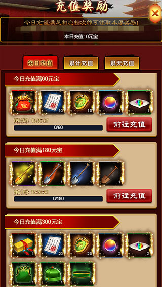 活动内容:在活动期间内,陛下每日充值达一定额度即可领取神秘豪礼相赠!