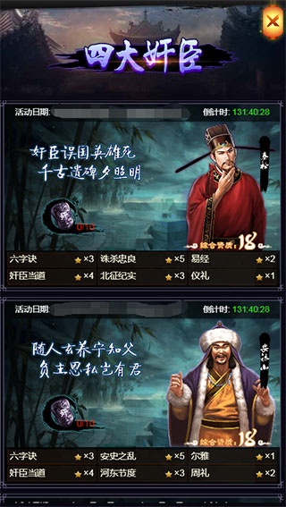 游戏还特别加入了四大奸臣和巾帼五虎的新光环系统,稀有门客满足条件后可以进行升级,增加额外加成。此外,游戏还推出了多个福利活动,包括冲榜、充值返利、签到奖励等,帮助玩家更好地体验游戏。